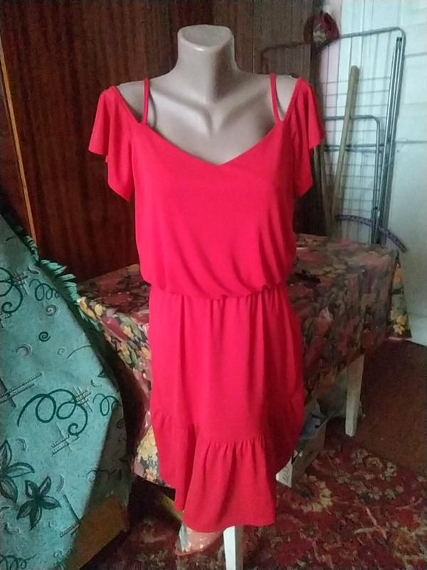 очень красивое красное платье с воланом понизу.На груди двойная ткань.Хорошо тянется и отлично смотрится.Размер м,л. описание состояние отличное длина со шлейкой 92 ширина груди 50 на талии резинка ширина бедер 53