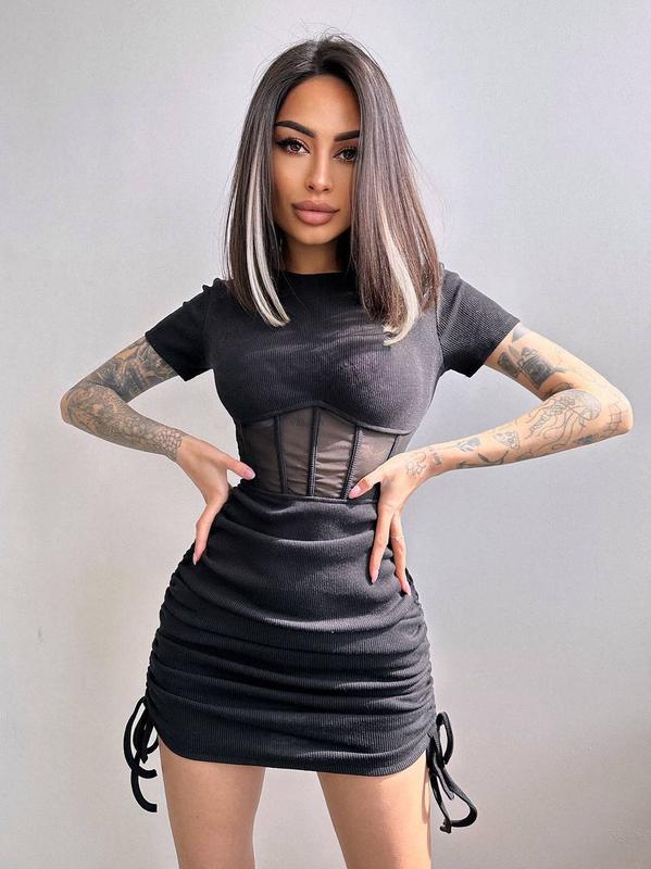 Сукня-міні з елементами корсету Довжину спідниці можна регулювати колір-чорний, білий, рожевий, зелений, блакитний, синій,сірий ▫️тканина: трикотаж рубчик ▫️розмір: Розмір S та М