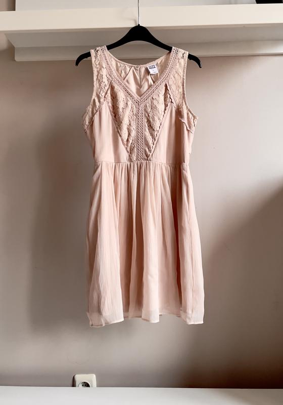 Пудровое платье из нежного шифона украшено кружевом, на стрейчевой подкладке, легкое и изысканное, отменного качества и кроя.Замеры смотрите на фото.