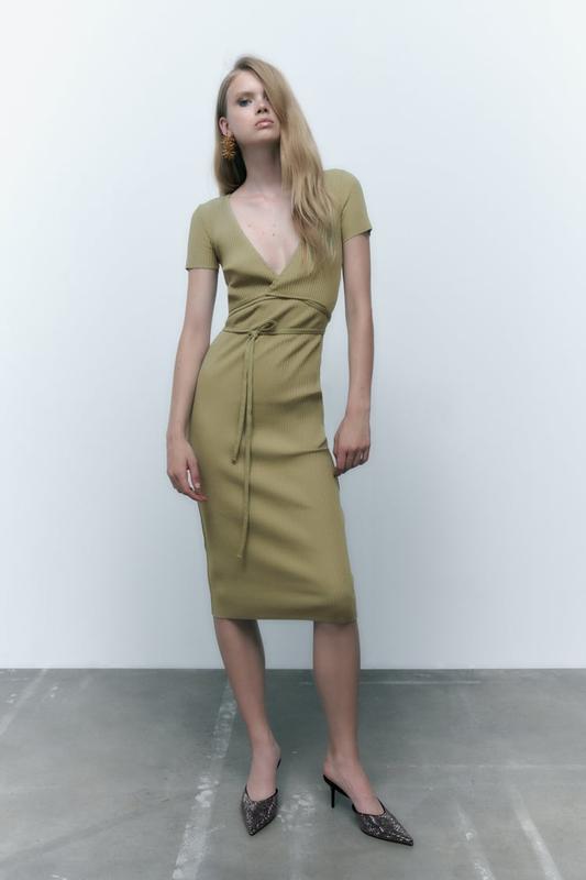 ZARA Сукня міді з V-подібним вирізом і коротким рукавом в рубчик, тягнеться, на грудях повністю на запах на зав'язках, можна регулювати об'єм самостійно в наявності S 94%бавовна 6% еластан