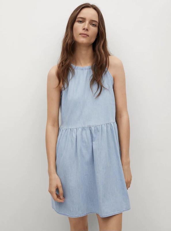 Бавовняна сукня з оборками Mango. 100% бавовна. Бавовняна тканина в стилі денім. Короткий дизайн. Розкльошений дизайн. Круглий виріз горловини. Халтерний виріз. Без рукавів. Оборка по подолу. Застібка на бант ззаду. Дві бічні кишені. Склад: 100% бавовна. Нова, куплена на оф. сайті. Розмір за біркою: M.