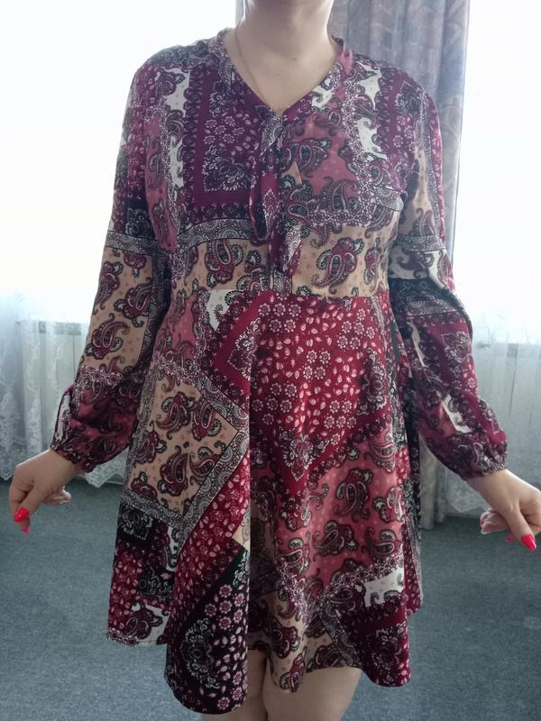 Симпатичное платье, нежное, женственное, с интересным, модным,современным принтом. Мне на рост 170 см немного закоротка. Одето на 52 р. Размер 54. Пог 57 см,пот 50 см,бедра свободные, длина 94 см.