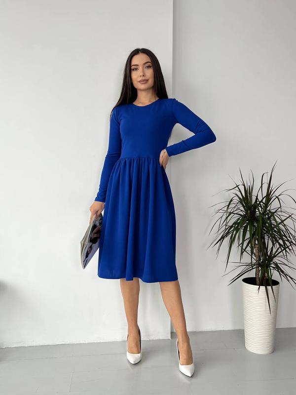 Сукня розширена вниз з м'якими складками, що починаються від талії. Верх сукні йде по фігурі, що облягає. Синя сукня приталені силуету, з еластичної бавовни, робить фігуру жіночнішою і ніжнішою. Довжина міді – за коліно. Довгий рукав. Сукня виготовлена з тканини трикотаж міцної, м'якої і приємної до тіла. Розмір: 40-422, 44-46, 48-50. Тканина: трикотаж, креп Кольори: чорний, бордо, смарагд, бузковий, синій Довжина сукні: 105 см