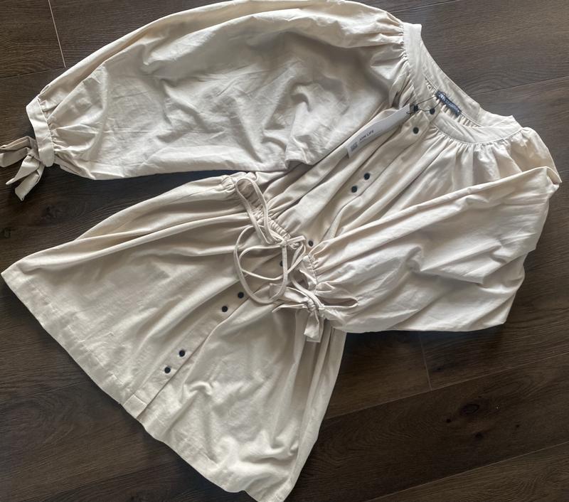 Супер стильное платье-рубашка с объемными рукавами. Нова. Не подходит размер. Можно носить как свободную рубашку так и сужать пояс как платье.