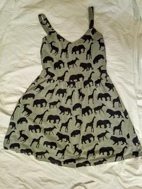 прикольное платье, светло-серого цвета, принт - черного (камера не совсем передает). размер S