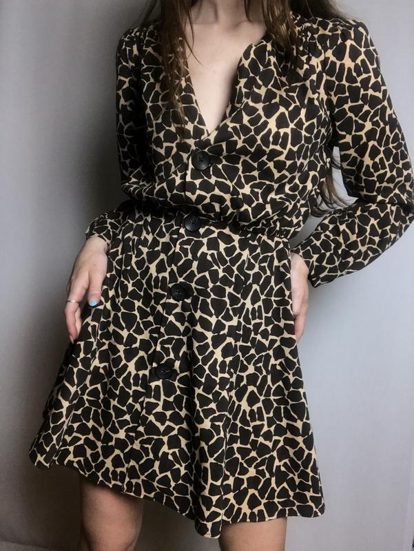 Сукня Zara з тваринним принтом, довгими рукавами і декоративними манжетами на гудзиках. З V-подібним вирізом, складками на талії та декоративною застібкою на гудзики спереду. Склад: 100% - поліестер. Розмір: вказано XS, але краще підійде на S Виміри: Напівобхват талії - 32-34 см, Напівобхват стегон - 53 см Довжина від талії - 45 см Довжина рукава- 58 см