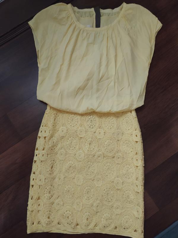 Верх платья штапель, на х/ б подкладке, низ-ширакное вязанное кружево из хлопковой нити, на подкладке х/б, спинка на молнии. Плечи спущены 62 см, ПО под руками 52 см, ПО талии 33 см, ПО бёдер 43 см, длина юбки 48 см.