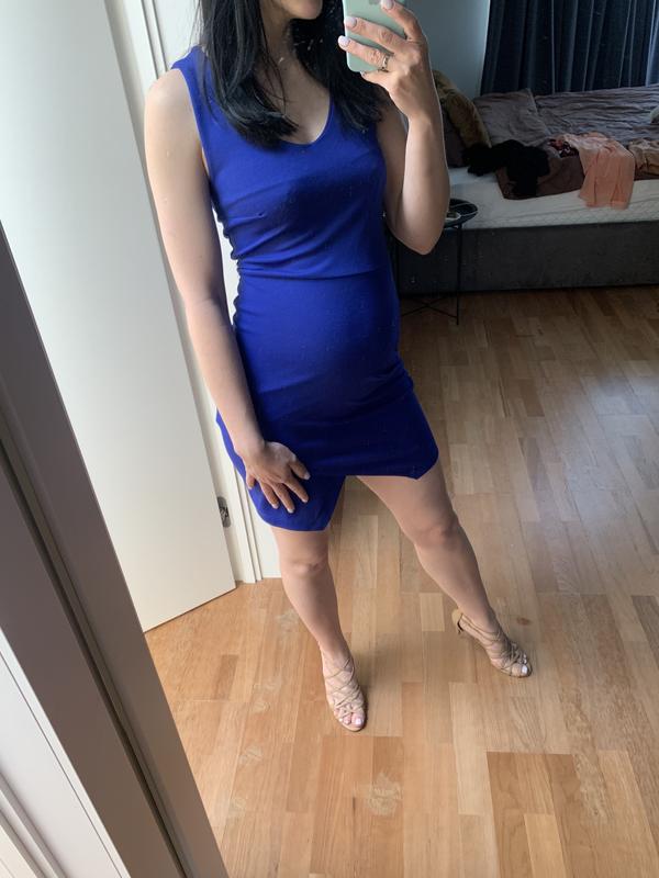Платье Mohito насыщенного синего цвета. Трикотажная, хорошо тянется. На размер Xs-S. Имеется нюанс (на фото) по шву, следует просто подшить, никаких дырок. Состояние 5 из 5, если не учитывать нюанс.