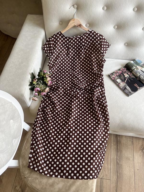 Атласное платье для беременных коричневого цвета в горох. Идеально сидит по фигуре. Ткань приятная к телу. Подойдет на S-M. Замеры: 1/2 ОГ 47-48 1/2 ОТ 42 1/2 ОБ 53 Длина 99 Рукав 10 Плечи 39 Состав: 95% полиэстер 5% Спандекс