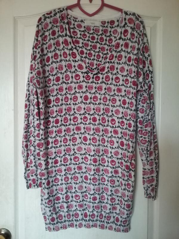 Очень стильная туника Next , можно носить как платье. Красивая приятная к телу ткань, яркий контрастный рисунок, спущенное плечо. Размер на бирке 12, вполне можно носить и на 14.
