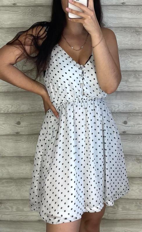 сукня на брителях в горох нежная, удобная модель пог 42-44,пояс резинка пот31 тянется 43, поб свободно, длина 81 Есть подкладка небольшой дефект на ткани