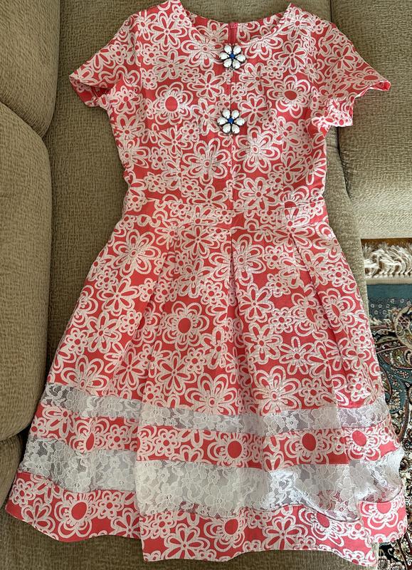 Женское платье в цвете красный с белым с кружевом Есть подкладка,не светится,длина чулочку выше колена Замок функционирует отлично Дефектов нет Размер S-M За деталями в приват !