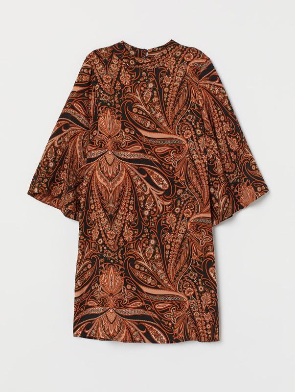 Короткое платье силуэта трапеция из вискозной ткани с набивным рисунком. Воротник-стойка, разрез и обшитые тканью пуговицы сзади сверху, а также укороченный рукав. Изделие без подкладки.Сток.