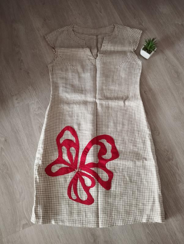 Легкое льняное платье с очень красивым красным цветком. Замеры вышлю.