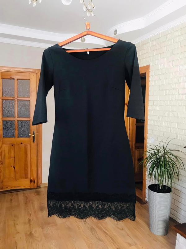 Черное платье с четвертным рукавчиком, снизу нашит гипюр В идеальном состоянии Размер 44-46
