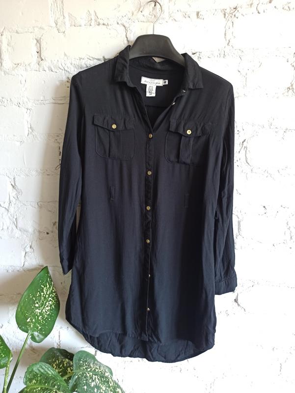 Сукня сорочка на золотистих гудзиках. С карманами на груди и боковыми карманами. Размер XS или на девочку до 152 см ростом. Нюанси: 1. На последнем фото виден микроэффект, увидела только когда начала делать замеры ( 2.Пояса в комплекте нет( поэтому цена занижена, в другом состоянии платья идеален. Замеры: Длина - 81 перед, 88 сзади Длина рукава - 56 Плече - 11 Ширина по груди - 50 Ширина по талии - 49 Ширина по стегнах -56