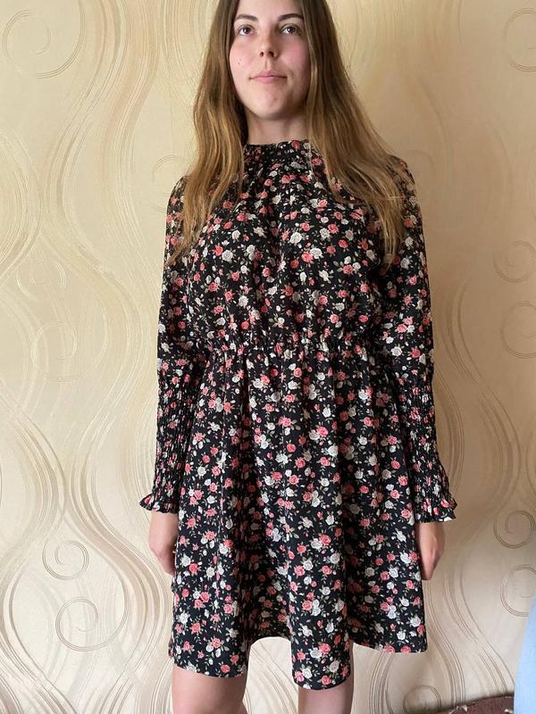 Стильна сукня, дуже легенька та комфортна. На талії та рукавах резинка. Матеріал: поліестер