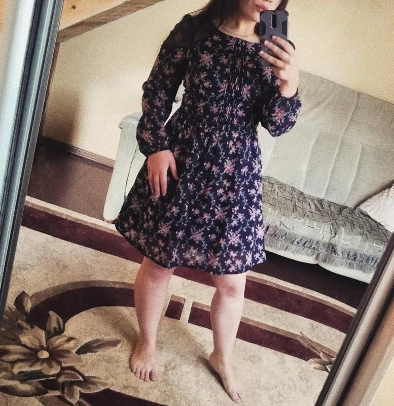 Платье темно синего цвета с узором цветов, длина до колена, повреждений нет, на талии вшита резинка, платье не просвечивается