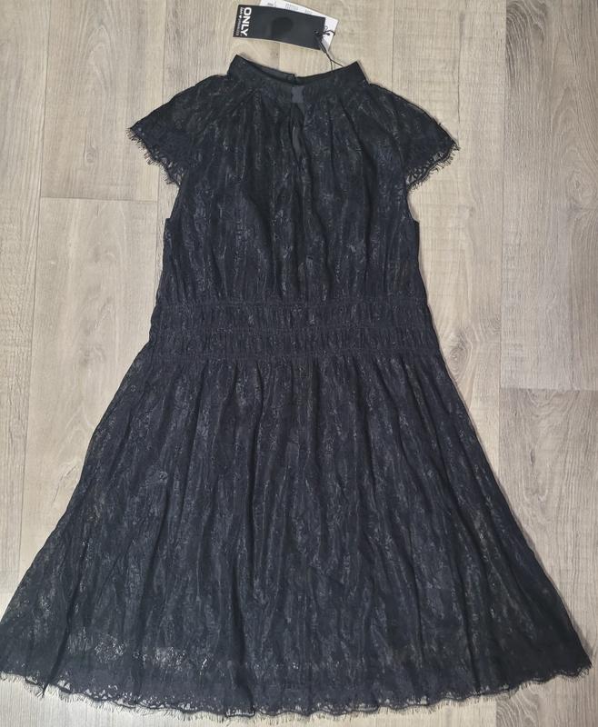 Черное платье мини из кружева Only, размер S. Имеет декоративный вырез спереди и сзади в виде капли. Талия на резинке. Мягкое и качественное кружево.