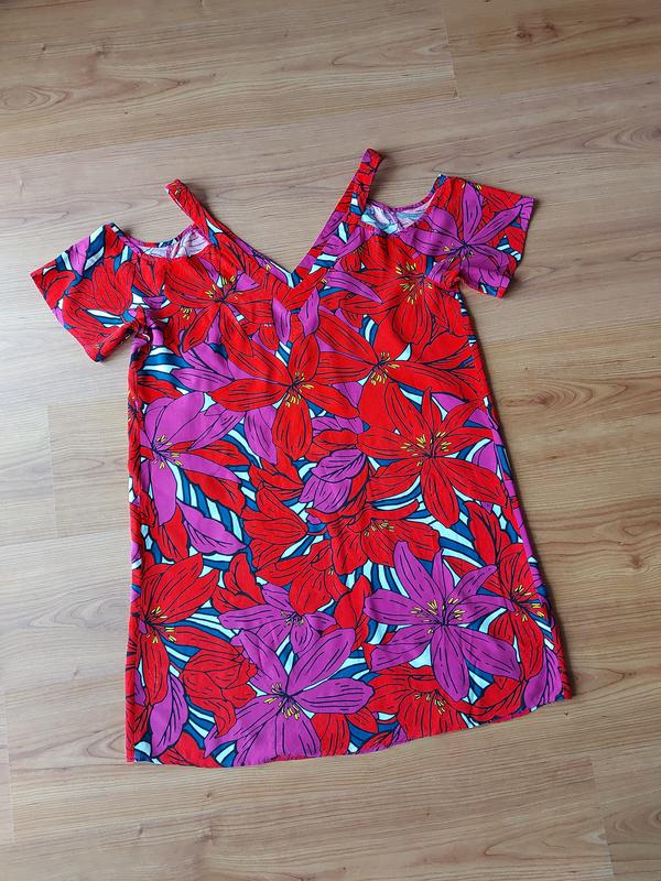 Очень яркое легкое вискозное платье, платье мини в цветы с открытыми плечами, р. 12. Прямого кроя, который немного расширяется к низу. Ткань легкая, приятная к телу, отлично на жару. В целом, состояние отличное, единственное - на спинке под вырезом по ткани белые ниточки (фабричный нюанс) и слегка потертая ткань на шлейке - последние два фото. В носке не заметно. Можно носить как домашнее платье, или как пляжное. Вещь выстиранная, без посторонних запахов. длина 86 ПО груди 50 ПО бедер 56 НП, УП, Мост.