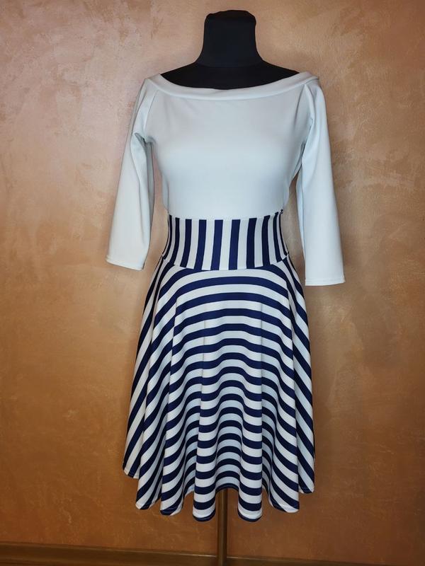 Платье с вырезом лодочка.Можна носить с опущенными рукавами.Ткань хорошо тянется. Замеры запить перед покупкой.