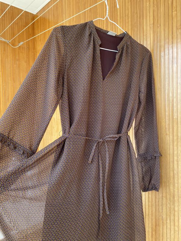 Платье с подкладкой и полупрозрачными рукавами. Длина - 93 см. Длина рукава - 59 см. Свободный крой, есть пояс