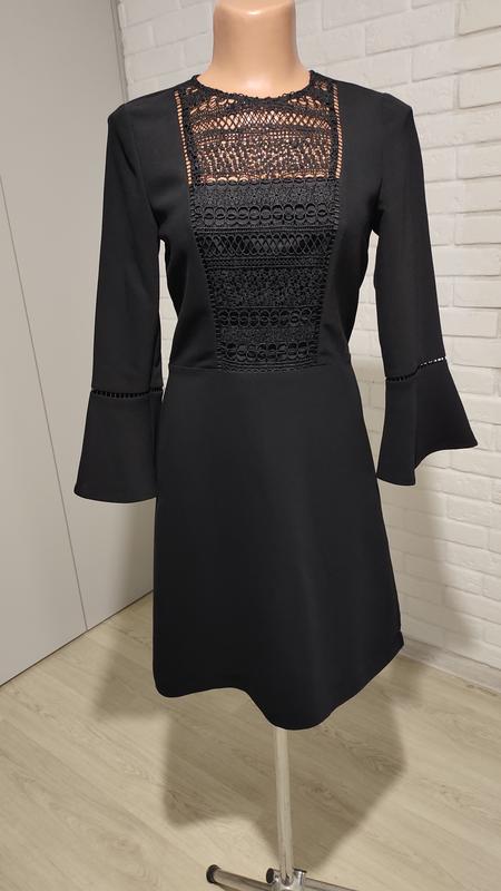 Маленькое черное платье с этническим элементом в виде кружева, красиво садится по фигуре, сзади застегивается на молнию. Платье А-силуэта с кружевной вставкой на лифе и расклешенными рукавами три четверти. Размер европейский 8, наш 40-42. Замеры НПО груди 41см., НПО талии 34 см., НПО бедер 48 см., длина рукава 50 см., длина платья 92 см. Платье в идеальном состоянии.