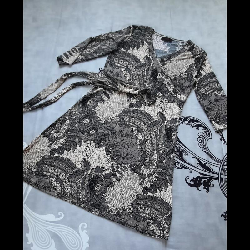 Платье нежно пудрового цвета с черным узором второе фото. Верх на запах, низ стандартный. Рукав 3/4 Ткань полексенный полистер, не мнется. Стан нового
