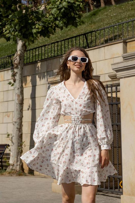 Нежное белое в цветочный принт в цветы батистовое платье с разрезами на талии.