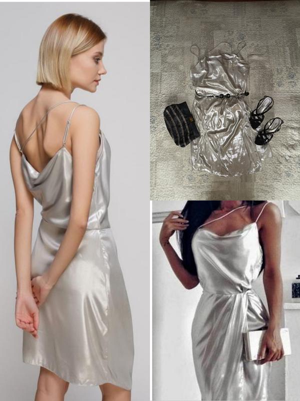 платье H&M серебряный металлик, лямки регулируются, подкладка(лиф, подол), низ на запах, сбоку молния, размер UK 12, EUR 42, грудь 48-52см, талия 40см, бедра до 53см, длина95-102см, нове, сток