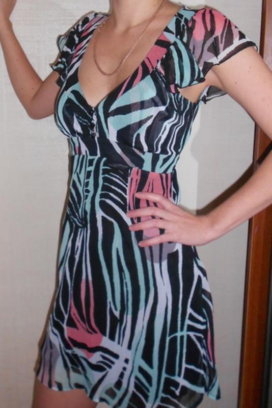 Легкое шифоновое летнее платье пестрой расцветки. Крой платья очень выгодно подчеркивает достоинства и скрывает недостатки фигуры. Размер XS, S. Материал 100% полиэстер. Все в отличном состоянии. Замеры по запросу.