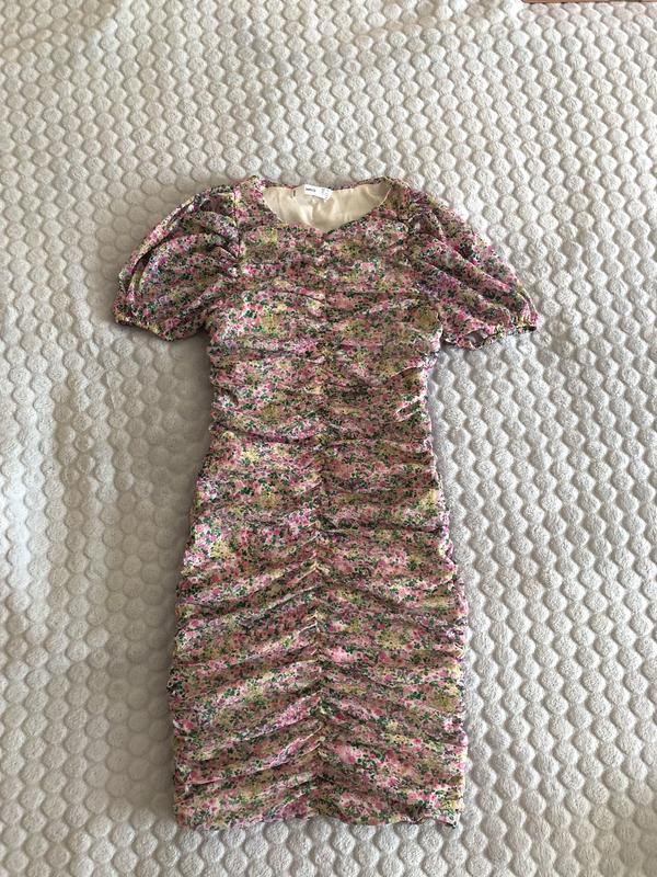 Платье мини со стяжкой посередине, мелкий цветочный принт, рукава воланы, застежка сбоку