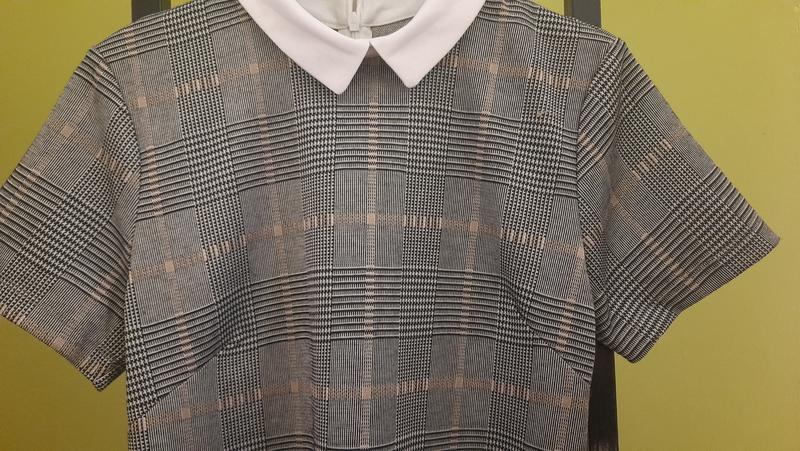 Цікаве плаття з біленьким комірцем . Короткий Рукав ,ззаду на блискавці Трапецевидний силует Довжина 82 см ПОГ 40 см Пот 37 см Пос 45 см Заміри в спокійному стані , тягнеться