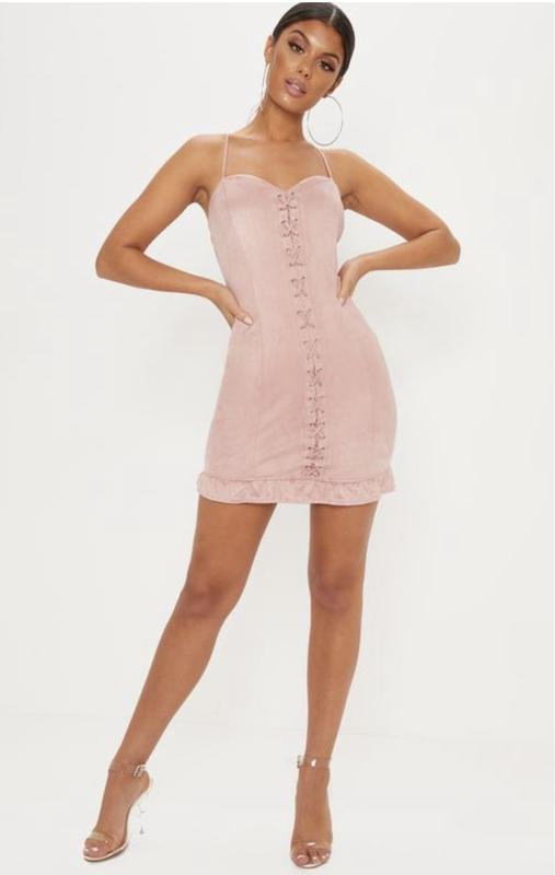 Не подходит размер ( Шикарное замшевое платье с шнуровкой и рюшами. Тканина легка, тягнеться. Выглядит супер😍 Размер указан 8/36/S, но ориентируйтесь по замерам Замеры (полуобхват) : грудь 38 (тянется до 45) талия 35-40 стегна 44-52 длина со шлейками 84