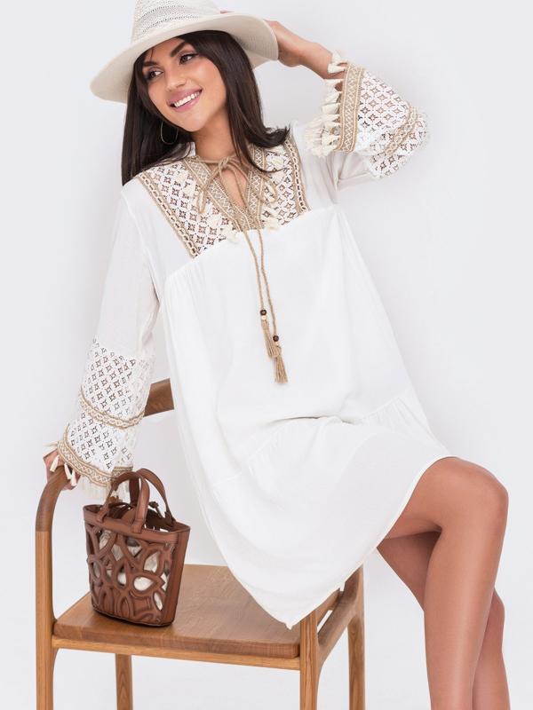 Платье с вышивкой. Изделие отрезное по талии. V-образным вырезом и завязками с кисточками. Горловина и рукава дополнены кружевом. Размер:44-46,46-48, 48-50, длина изделия - 90см длина рукава - 58/68см. Состав: 80% коттон, 20% полиэстер Цвет: белый Материал: Коттон Цена 1490грн Арт90427