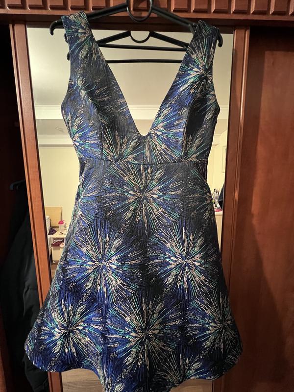 Дуже шикарна сукня, яскраво синього кольору з вишитими узорами схожими на салют чи бризки шампанського 💜Шикарне декольте та відкрита спинка Вона має такі розміри Объем грудей 90 Талія : 70 Довжина : 92