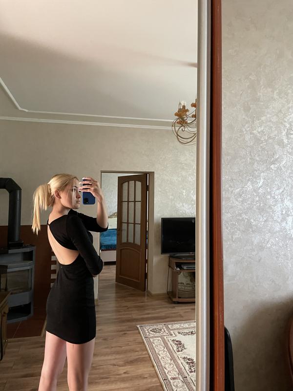 Платье мини, с открытой спиной, имеет рукав 3/4, размер М