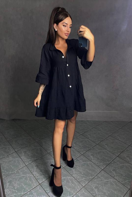 Стильное черное платье трапеция свободного кроя из муслина 3 цвета