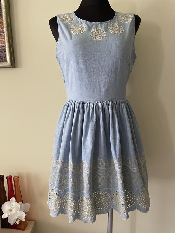 Невероятно красивое и удобное платье из легкого летнего джинса нежного голубого цвета. Вышивка кремового цвета. Платье имеет два кармана в боковых швах и молнию с левой стороны. Длина- 86 ПОГ - 47 ПОТ - 37 ПОБ - свободно