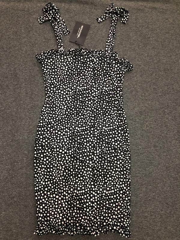 Сукня в горошок, бретели завязуються за допомогою цього можно скоректиртвати потрібну довжину бретелі щоб сукня краще сіла, вгорі та знизу є рюші Залишилося 2 Розміра : UK-10; UK-8