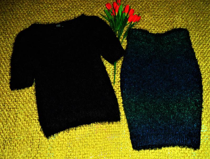 шикарна добірка з комбінованих в'язаних виробів(можливо костюм а може добірка) верх кроп топ травичка-чорний низ спідниця футляр травичка комбіновані кольори,чорний,синій,смарагдово зелений рр на виробах 12 виміри кроп-топ довжина-45см пог-41(55)см пот-38(55)см по низу-37(50)см рукав-21см спідниця-футляр довжина збоку-46см пояс-36(53)см побіди-38(60)см низ-41см(тягнеться).