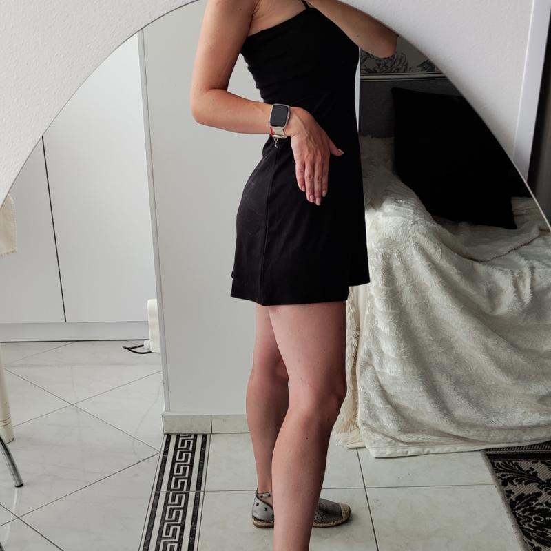 Короткое черное платье из синтетического материала мой рост 158, я выглядела отлично не было коротким. Длина платья - 60 см