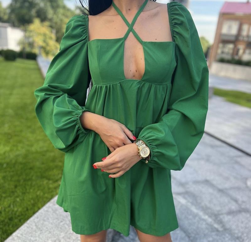 Платье в зеленом цвете. Легкая и приятная к телу, ткань софт. Плечи на резинке можно носить приспущенными. Размер 42-44. Длина платья от плеча 84 см. Длина рукава 70 см.