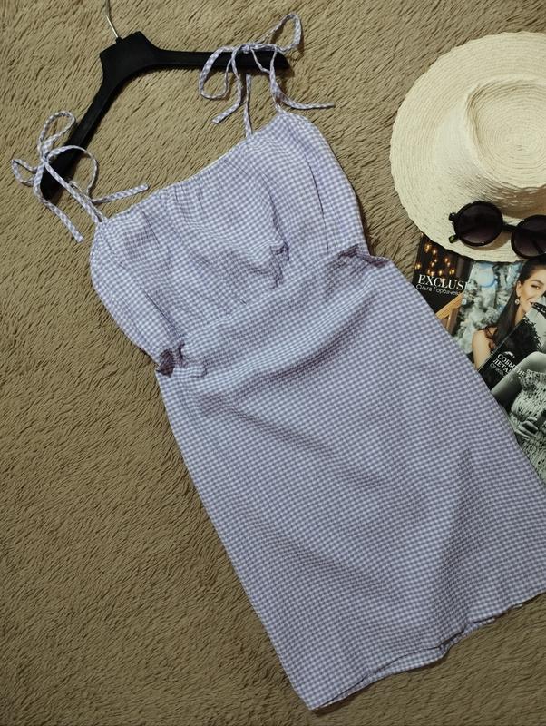В идеальном состоянии. Актуальное платье в клетку на завязках. Тканина легка , трошки тягнеться. На груди подкладка. Сбоку молния. Размер 16/44/2ХL, но смотрите по замерам Замеры ( полуобхват): Грудь 49 (тянется до 53) Талия 43 Бедра 55 (тянется до 59) Длина с шлейками 90