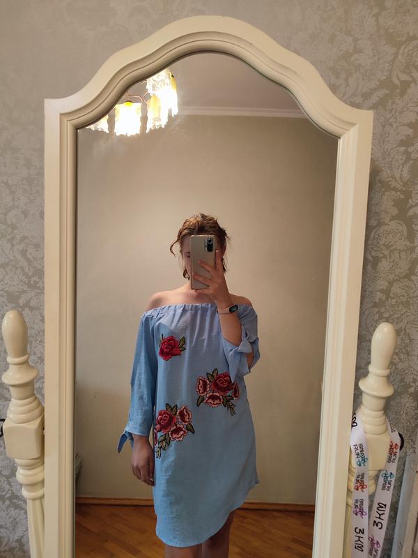 Женское платье, подойдут на лето/весну. На резинке, носится на плечах. Рукава немного длиннее локтей. Длина до колена. Нежно голубого цвета с яркокрасной вышивкой. Напоминает на современную вышиванку.