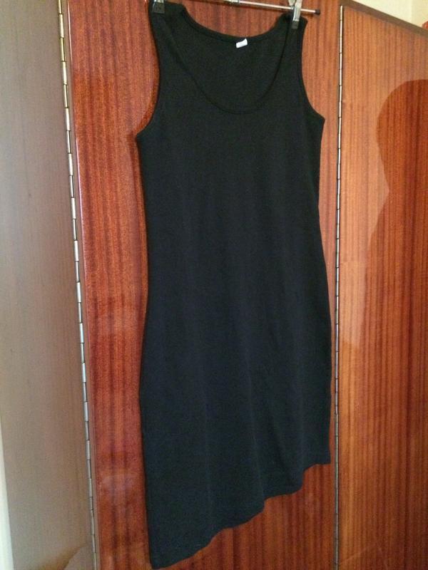 Платье трикотажное , ткань плотная , цвет чёрный, на фото цвет искажает . Длина с одной стороны 87 см , с другой 84 см , такой фасон . В груди 41 см , талия 40 см , ширина низа 49 см , бедра 45 см .
