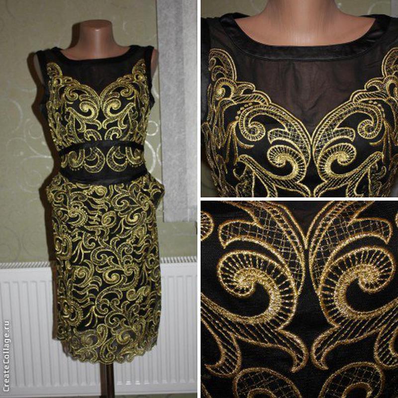 Черное вечернее платье с золотистой вышивкой, на талии с баской.