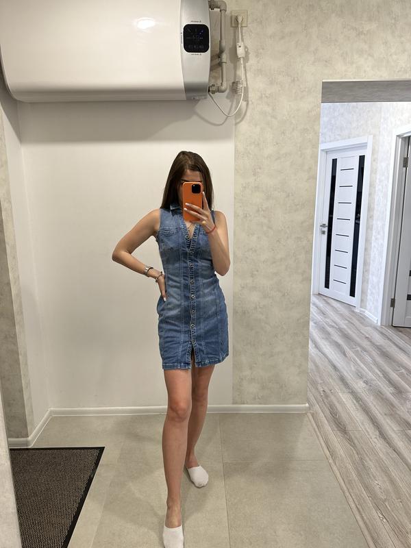 джинсовое платье размер S , тянется , хорошо садится по фигуре.