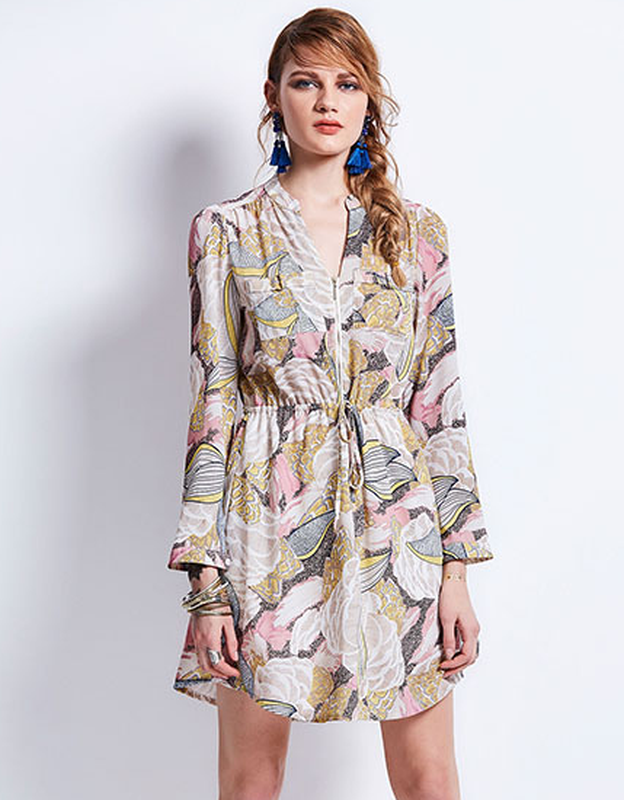 Мини-платье с длинными рукавами, имеющими пуговицу для укорачивания. Горло-стойка. Платье на молнии к поясу, на поясе ведеркочка для затяжки. Нагрудные карманы "патронные" - из трех узких отделений. Фурнитура (на кармане, молния, на поясе) золотистого цвета. Замеры: плечи 38 см, бюст 100 см, талия 100 см, бедра 114 см, длина 92 см, рукав 62 см.