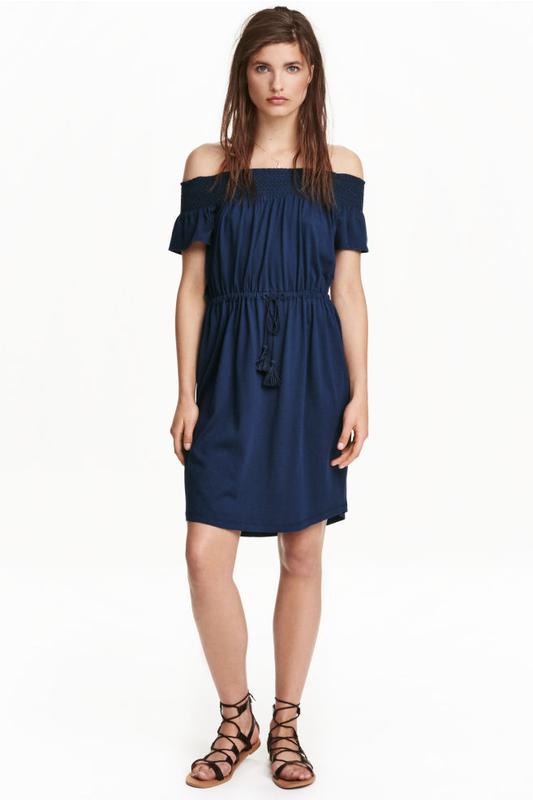 Трикотажное платье длиной до колена. На платье открытые плечи и вафельная резинка сверху. Короткий рукав. Отрезное по талии на кулиске. Размер XS, на ОГ-80см, ОТ-64см, ОБ-88см. На рост 160см. Повреждена внутренняя бирка.